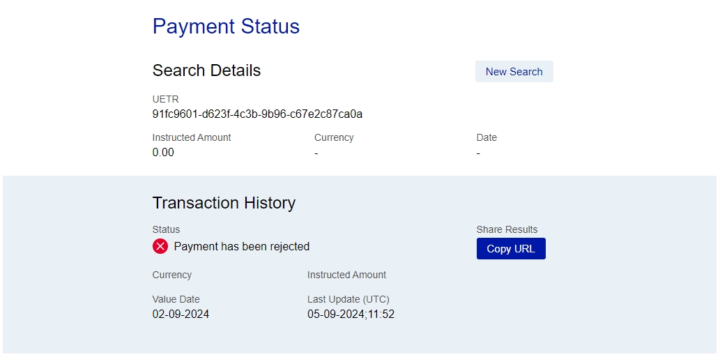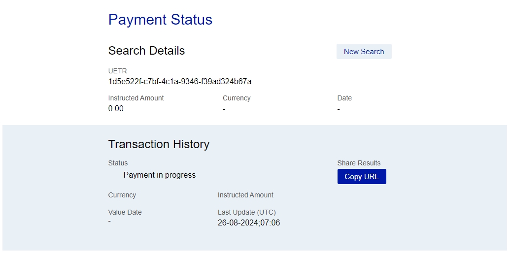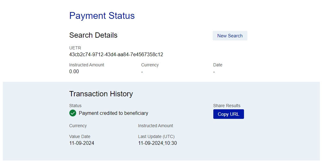 Once you obtain the UETR for your transfer, copy it and navigate to the Deutsche Bank website. Scroll down to the Payment Status Search section. Paste your UETR into the Unique End-to-End Transaction Reference field and press the Search button.